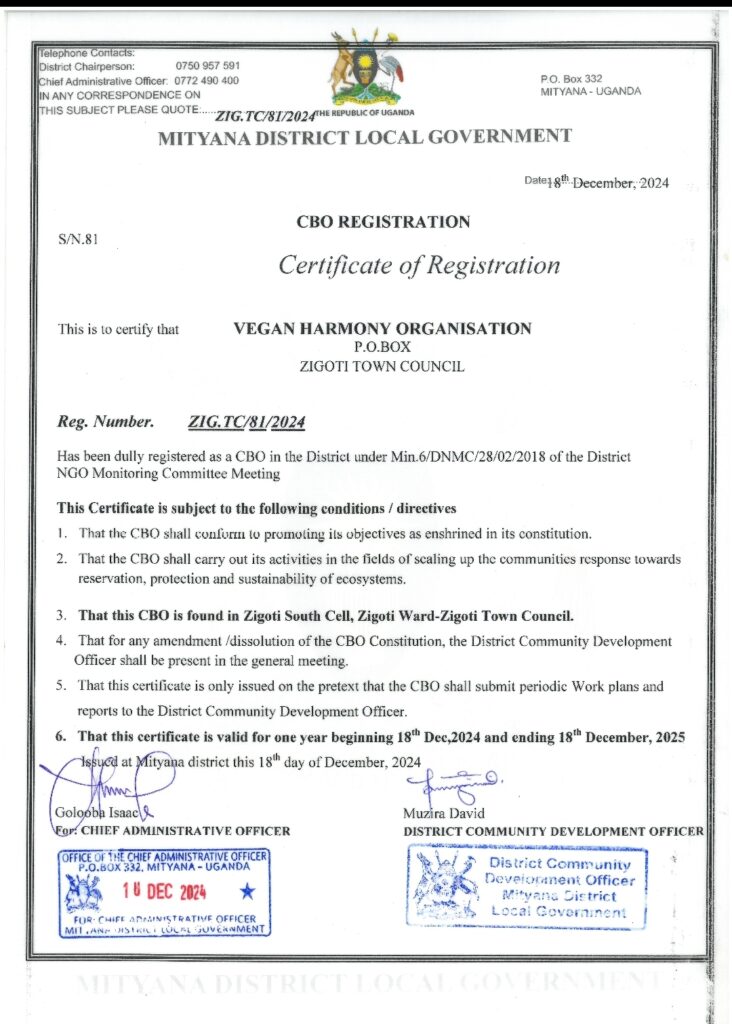 Vegan harmony is legally registered by the government of Uganda